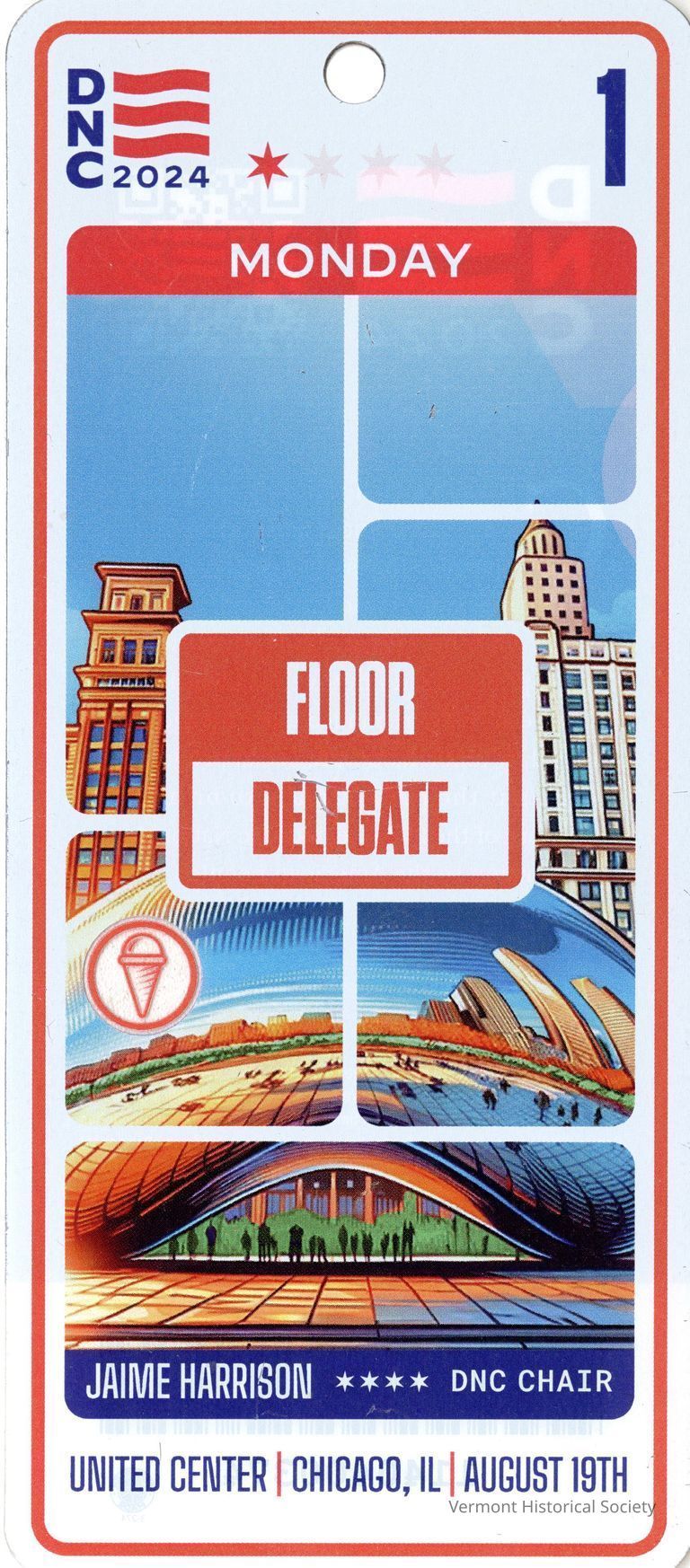This pass was donated by a member of the Vermont delegation to the 2024 Democratic National Convention that nominated Kamala Harris for President and Tim Walz for Vice President. "Floor Delegate" was the highest level of delegate pass, providing the closest level of access.