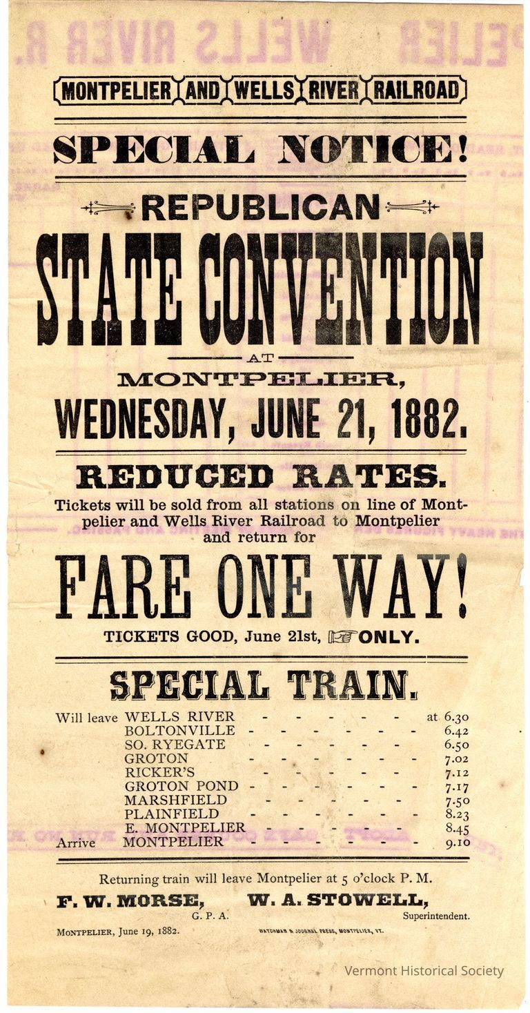 Broadside advertising special railroad fares for travel to the 1882 Republican state convention