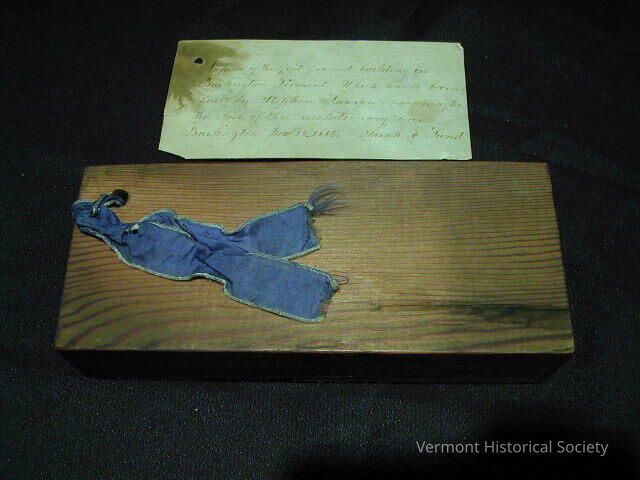 Blue ribbon tied to wooden block (a)and piece of paper documentation (b). The wood block has a hole drilled through one corner, though which the ribbon has been tied. There is silver edging on the sides of the ribbon. Handwritten on the paper is "A piece of the first framed building in / Burlington, Vermont. Which was a barn, / built by Stephen Lawrence, soon after / the close of the revolutionary war. / Burlington Nov 14. 1864. Sarah E. Lund", and it is separated from the board.