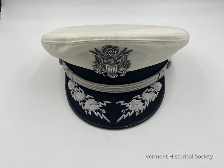 White military hat with black bill worn by Air Force Brig. Gen. Edwin L. Little. Hat has eagle emblem on front and silver band. On the bill are two sets of three clouds with lightning. These so-called thunderbolts represent U.S. air power. Inside the hat is a label that reads "Berkshire DeLuxe, trade mark reg., Distinctive in Style and Construction." Another label says, "All Wool, Lee Uniform Cap Mfg, Co., Baltimore, Md." (See 2001.33.2 for black top that could replace the white part of this hat.)