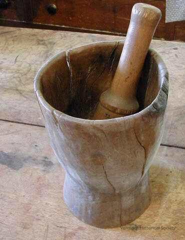 Large wooden mortar (a) and pestle (b). The mortar has been formed into a tall cup that narrows into a base that flares out. It is cracked in several pleases. The rim is warped. The bottom half of the pestle wide, narrowing into a thinner handle.
