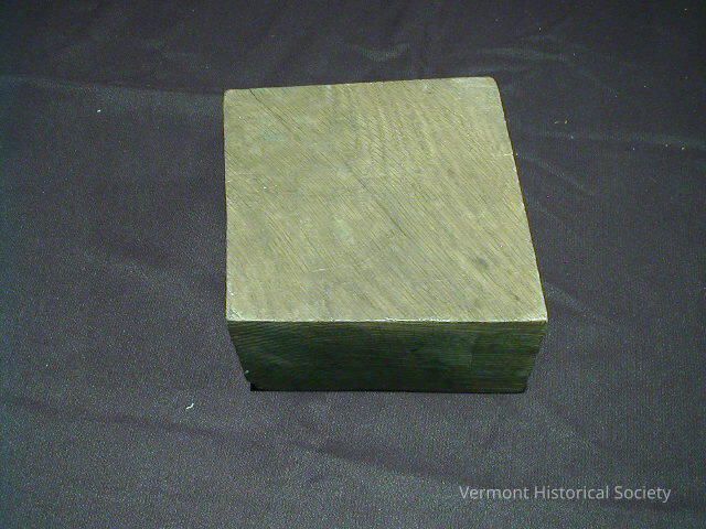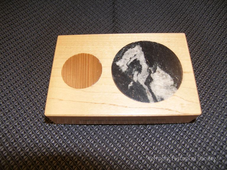 Memento from dedication ceremony of DeForge Hydroelectric Station. Block of wood with two circles embedded on surface, one circle of stone and one circle of wood. Printed on one side: "Stone from the diversion tunnel and Wood from the original dam, built in 1898" Printed on opposite side: "DeForge Hydroelectric Station" Printed on one end: "Green Mountain Power Corporation" and company logo. Green felt bottom.