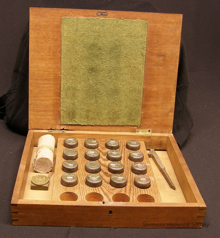 Wooden box containing 17 stamp dies, a press, and metal pick. The dies are all engraved in reverse, and are as follows: