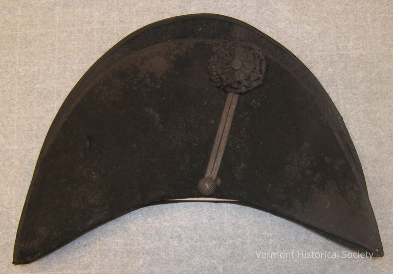 Bicorne felt hat belonging to Roswell Miner when serving from Connecticut in the Revolution. White paper note pinned to inside lining removed (with worksheet) reads: "Roswell Miner fought under Washington in 1776" Black hat appears to be all original with black silk rosette at the top left (front) with two pieces of flat braid attaching to a metal button at the bottom edge. On the left front there is a 1" piece of black ribbon coming out from inside the hat. Interior lining appears to be original with black gauze on the crown. On the back there are two holes (original to piece) where at one point braid strung between them. There is a mark on the hat where the braid was up against it for a long period.