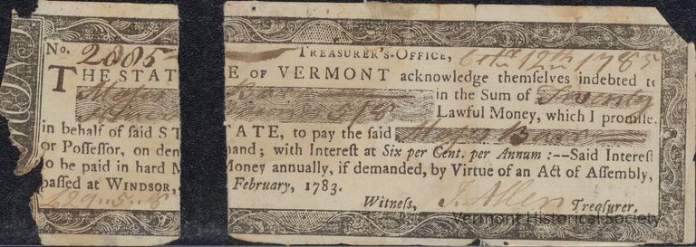 Issued by the State of Vermont for paying soldiers on credit during and shortly following the Revolutionary War. The certificates were redeemed by matching the the wavy-torn side of the certificate to the corresponding torn stub, kept by the State.