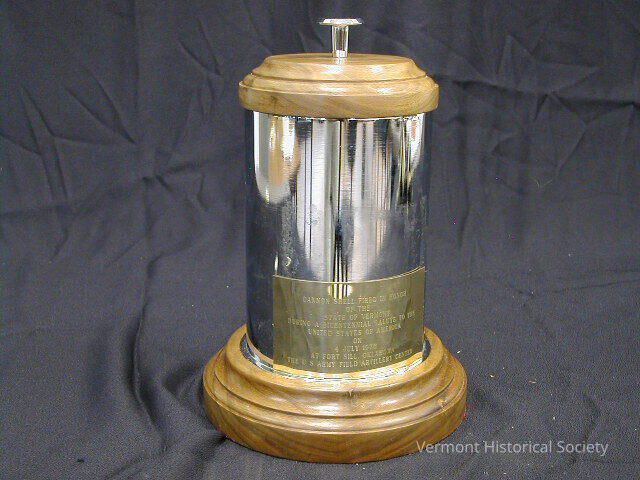 Canister made from a shell casing. The bottom of the canister has the inscription, "105 MM M14B1 RMO-206-2 6-53". There is a plaque that reads, "CANNON SHELL FIRED IN HONOR OF THE STATE OF VERMONT DURING A BICENTENNIAL SALUTE TO THE UNITED STATES OF AMERICA ON JULY 4, 1976 AT FORT SILL OKLAHOMA / THE US ARMY FIELD ARTILLERY CENTER". The canister is mounted at the top and bottom with light-colored wood.