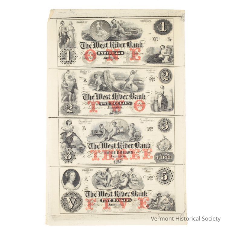 Uncut paper money in four denominations, 1, 2, 3, and 5. All the notes are inscribed in the center with, "The West River Bank/Will pay [denomination] Dollars in demand/to the bearer. Jamaica, July 1st, 18__" The denomination is also written in red letters with grey shadows in a different font and offset to the lower left. The denominations also appear in numerical form in the upper right within a circular seal, and in the lower left within a decorative cartouche. (The 1, 2, and 3 are in Arabic numerals, and the 5 is in Roman numerals.)
