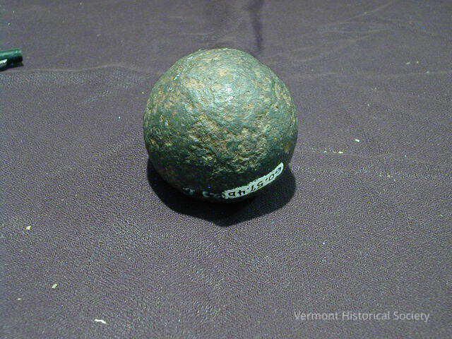 Round iron cannonball. A typed card accompanying the cannonball reads, "Oak and cannon ball from the Royal Savage, Benedict Arnold's flagship, on Lake Champlain in the Revolution."
