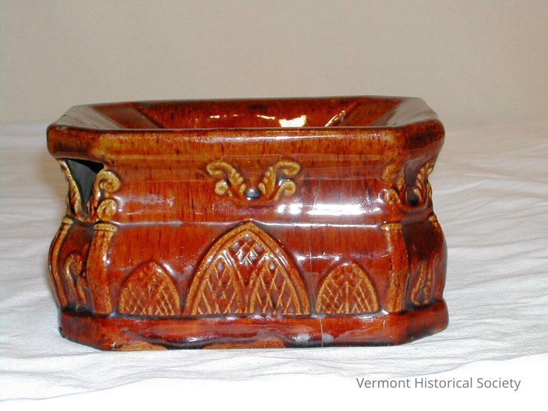 Rectangular spittoon with flared top and molded designs. The molded designs are architectural, featuring columns at the corners and gothic windows on the sides. The top slopes inward to a circular opening, and another semi-circular opening is on one of the short sides. The bottom is impressed with the makers mark, "Ba[illeg]/Burlington, Vt." The surface is decorated with a very slightly striated brown glaze.