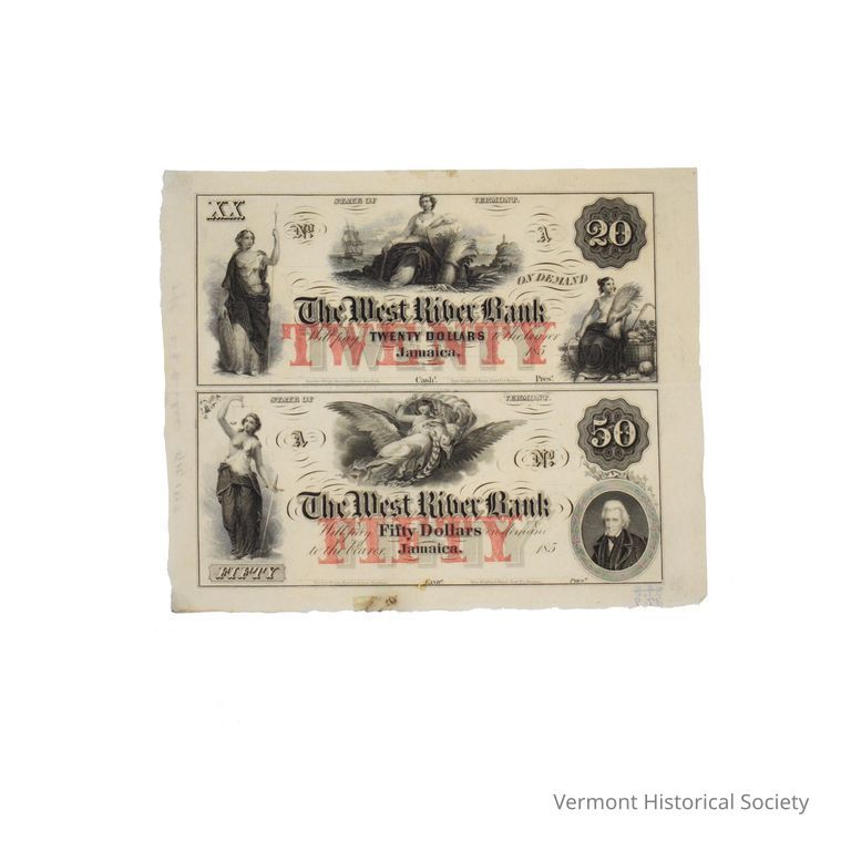 Uncut paper money in two denominations, 20 and 50. Both notes are inscribed in the center with, "The West River Bank/Will pay [denomination] Dollars in demand/to the bearer. Jamaica, 185" The denomination is also written in red letters with grey shadows in a different font and offset to the lower right. The denominations also appear in numerical form in the upper right within a circular seal. The twenty is also labeled in the upper left with Roman numerals (XX), and the fifty is also labeled in the lower left written out.