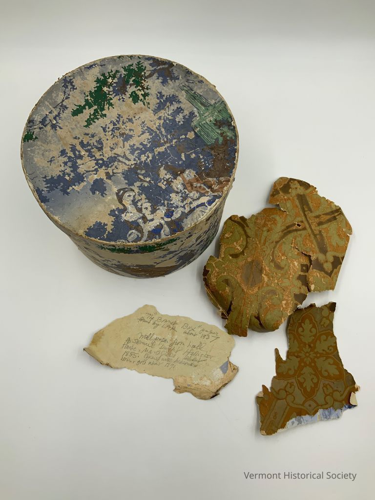 Round hatbox covered in blue wallpaper. Inside is a fragment of the same wallpaper sample with the handwritten note: "The 'Bonnet Box' paper found by LAK [Louise Andrews Kent] about 1937. Wallpaper from hall of Samuel Dwight Hollister House, Marshfield, about 1855. Covered with hideous brown and gold about 1890." A sample of the brown & gold paper is inside.