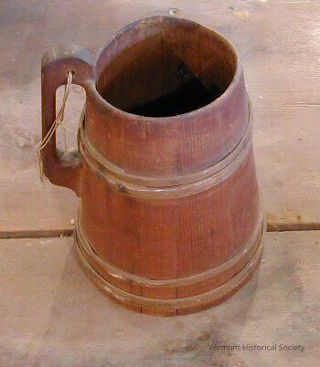 Wooden tankard constructed similarly to a barrel. The tankard is straight-sided, tapering inward from the base to the top. It is constructed of straight wooden slats, and there are four wooden rings nailed to the slats around the outside. A wooden handle is nailed to one side and spans from the mid-point to the top.