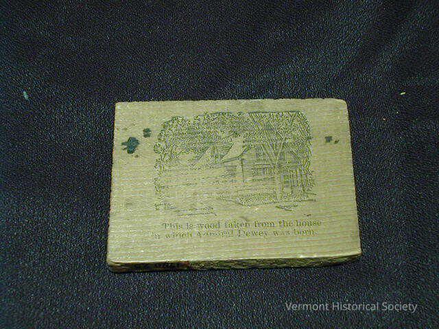 Wood fragment etched with a design of a home. Text at the bottom reads "This is wood taken from the house / in which Admiral Dewey was born". The opposite side is painted with pale mustard colored paint, and has a few cracks and chips.