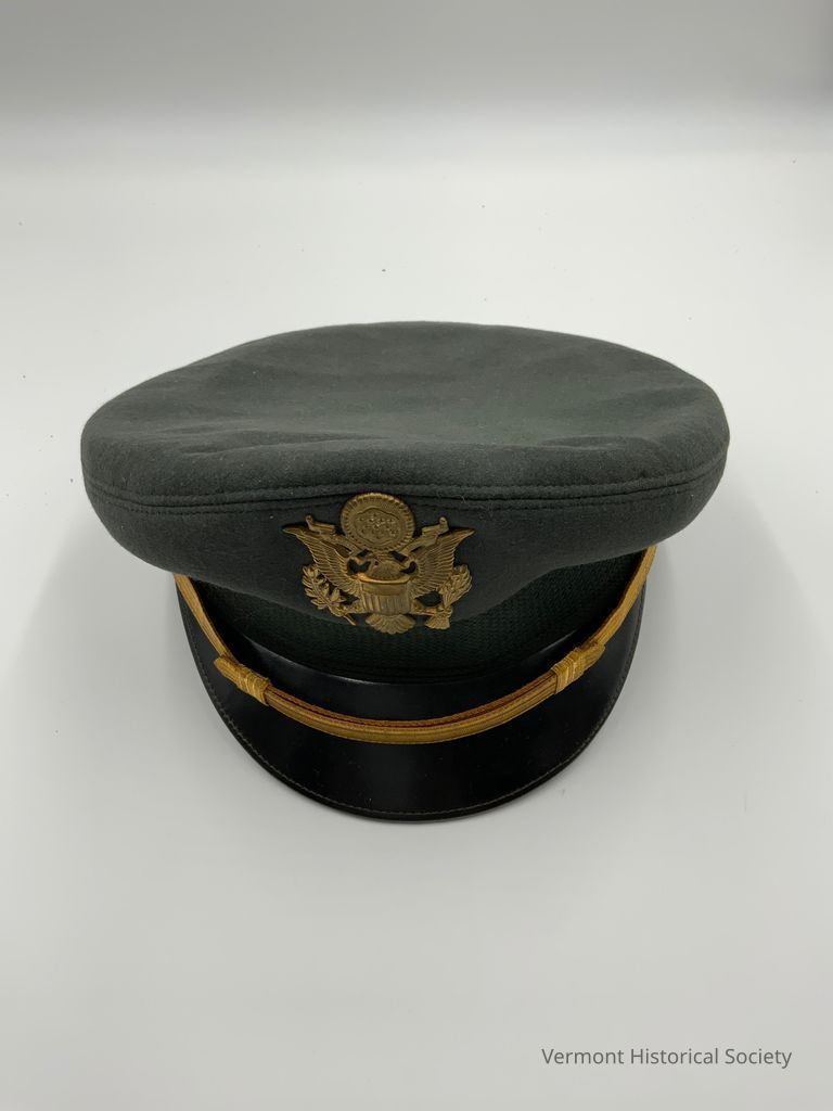 Green military hat with black bill. The hat has a gold eagle emblem on the front, and across the bill is a gold band fixed with to either side of the hat with gold buttons. The inside of the hat is quilted gold fabric, with a label that reads "BANCROFT / Military Caps / FRAMINGHAM / MASS." on a diamond shaped label.