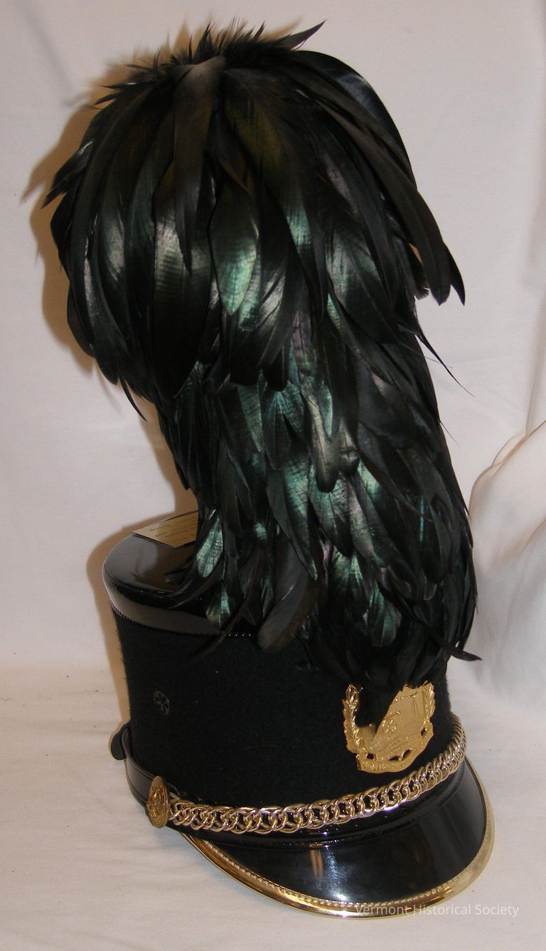 Presentation shako with leather and felt crown and brim and large, black feather plume. A brass plaque on the top of the crown reads, "In Memory of Dr. Howard Reid 1912 Presented to Marjorie Strong of the Reid Family in appreciation for their dedication and support to the Norwich University Cavalry Troop". A heavy gold chain spans the front the of the hat, and a large brass medallion is at the center front that reads, "I WILL TRY CAVALRY UNIT NORWICH UNIVERSITY". The interior of the hat is marked, "Bayly, Inc. Size Medium Holywood, FLA."