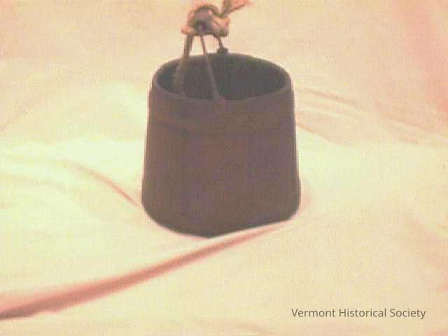 Wooden sap bucket. The bucket is 10 inches in diameter at its opening, and slightly wider at the base. It is made of multiple wooden slats, held together by two metal bands, one at the top and one at the base. There is a metal handle with a wooden grip and a tied piece of rope affixed to the top of the bucket.