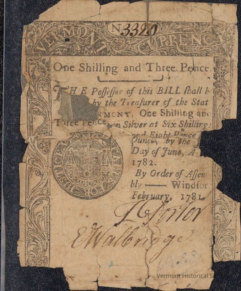 Paper money with a floral border design. The edges are torn and there are sections missing. Inside the top border are the words "Vermont Currency" and and the serial number "N3320". The center has been printed with the text "One Shilling and Three Pence / The possessor of this BILL shall be [loss] by the Treasurer of the State / [loss] RMONT, One Shilling and Three Pence in Silver at Six Shillings / and Eight Pence [loss] / Ounce by the J[loss] / Day of June, A [loss] / 1782. By order of Assem / bly -- Windsor February, 1781.", and to the left is a printed circular seal that reads "VERMONT CALLS FOR JUSTICE." around a set of scales. It is signed by L. Porter and E. Walbridge. The other side has the inscription, "Fifteen Pence / Death to counterfeiters / WESTMINSTER / Printed by Spooner / and Green. 1781." within a similar border.