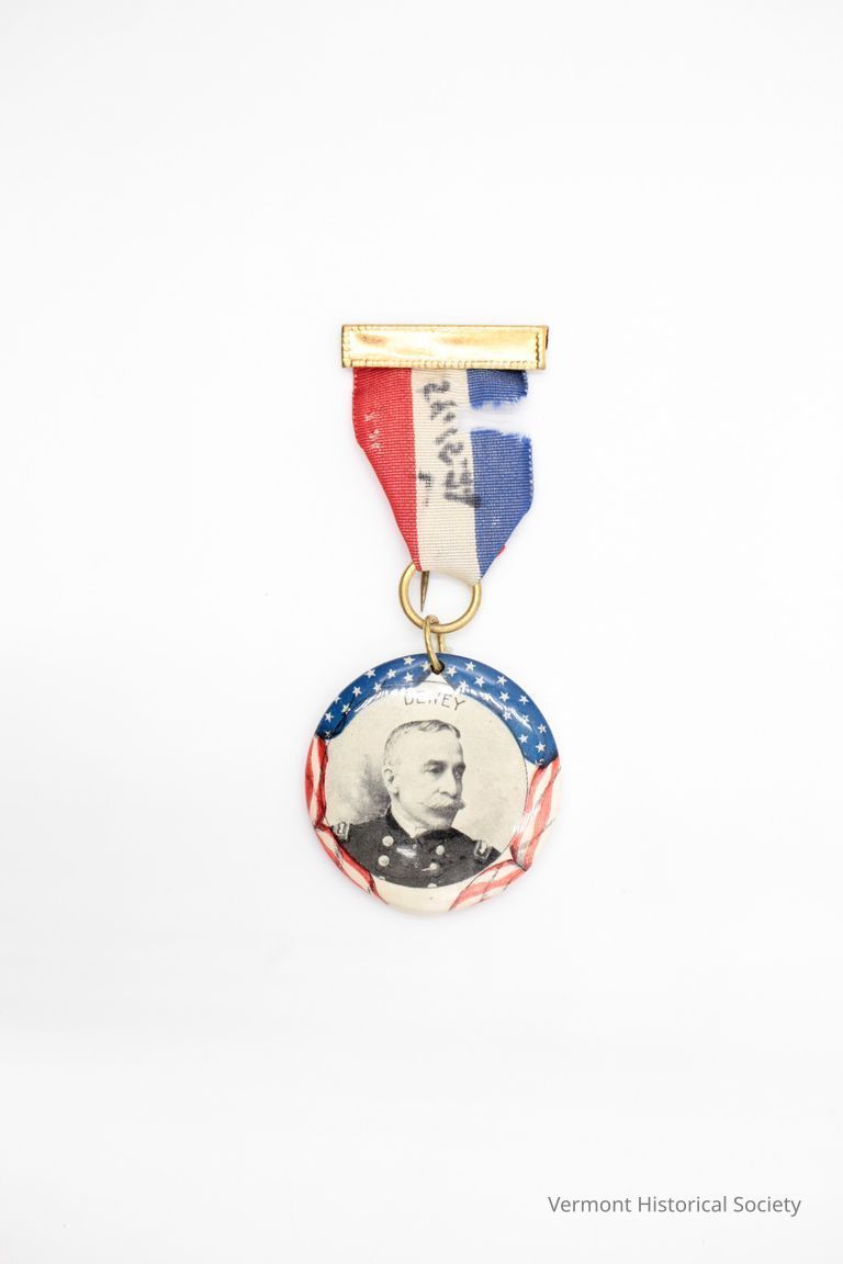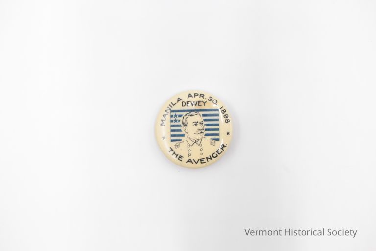 This is one of the many commemorative coins and badges produced for celebrations of Admiral George Dewey, a native son of Vermont, who became an American hero after he destroyed the Spanish fleet at Manila Bay during the Spanish American War.