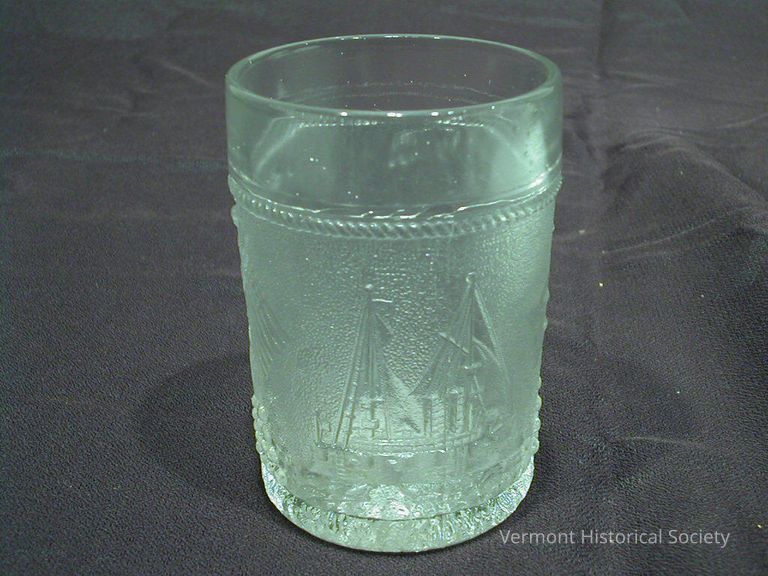 Pressed glass tumbler heavily molded with imagery of Admiral George Dewey and militaria. The glass is molded to have a rough ground, bordered on the top by a rope and the bottom by repeated stacks of cannonballs. One side shows a bust portrait of Dewey within a laurel wreath topped with a flying eagle. The other side shows crossed flags over a cannon. Between the two is a molding of a two-masted ship.