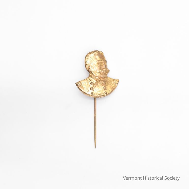 Gold-toned stamped metal pin in the shape of a bust of Admiral George Dewey. There is a long stick pin attached to the back, extending downward.