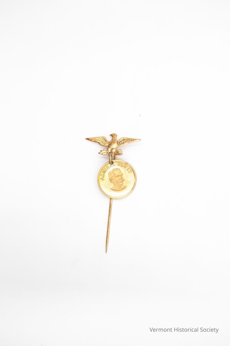 Gold stickpin topped with a spread eagle and with a small round medallion. The front of the medallion is molded with a bust of Admiral Dewey with the label, "ADMIRAL DEWEY". The back of the medallion shows a warship with the label, "FLAG SHIP OLYMPIA".