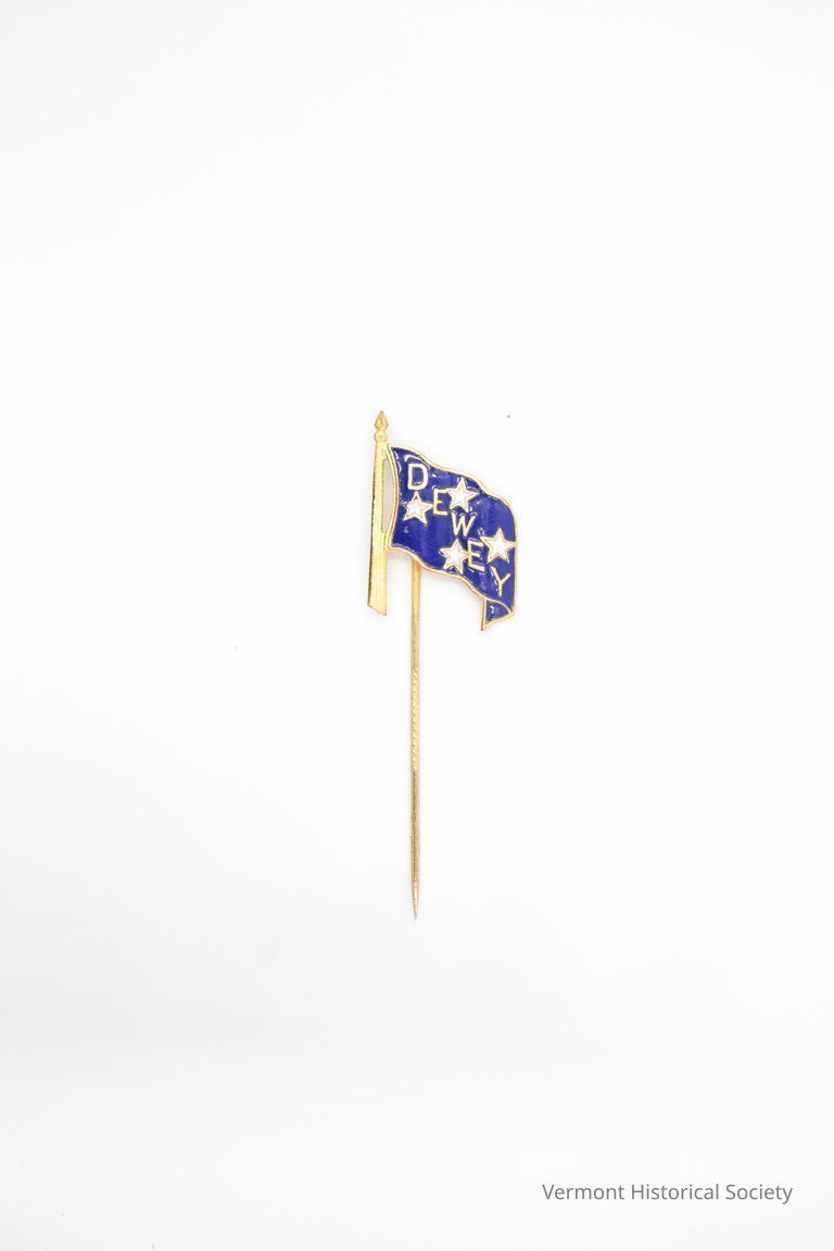 Gold stickpin topped with a blue-enameled flag with four white stars and the word "DEWEY". A long pin extends downward from the back.