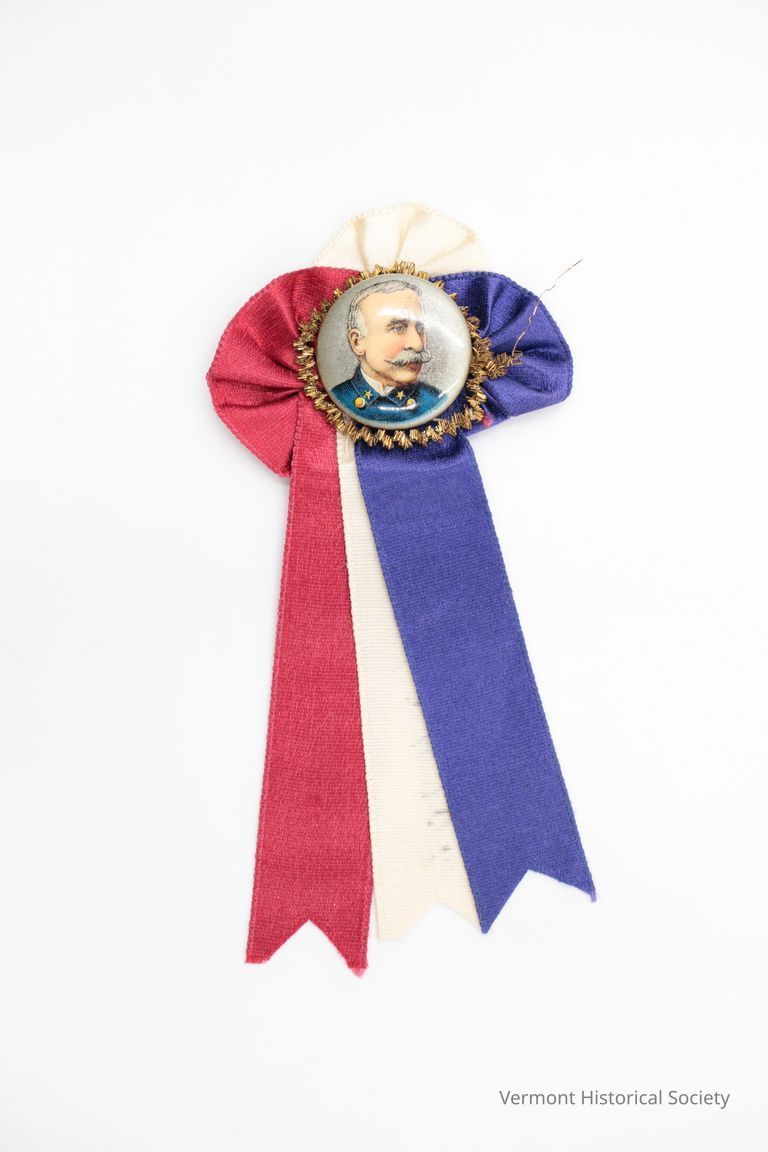 Commemorative ribbon pin consisting of three ribbons and button. The satin-woven ribbons are red, white, and blue. There are formed into three rosettes or cockades, and three tails hang below. At the center of the three rosettes is a round ceramic button printed with an image of a man with a large mustache (Admiral Dewey) and surrounded in gold tinsel trim.
