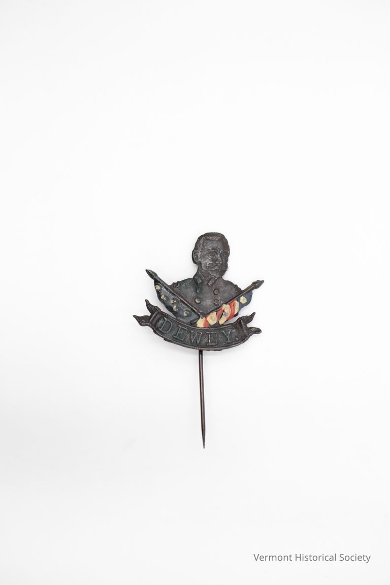 Stamped metal pin in the shape of a bust of Admiral George Dewey with two painted flags and the inscription "DEWEY". There is a long stick pin attached to the back, extending downward.