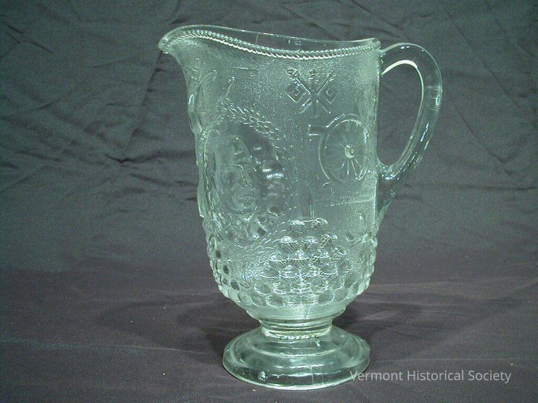 Pressed glass pitcher molded with a bust portrait of Admiral George Dewey and military imagery. It is molded to have a rough ground. The top is bordered with rope and the bottom is molded with stacks of cannonballs. The military imagery includes cannons, crossed swords, flags, and ships.
