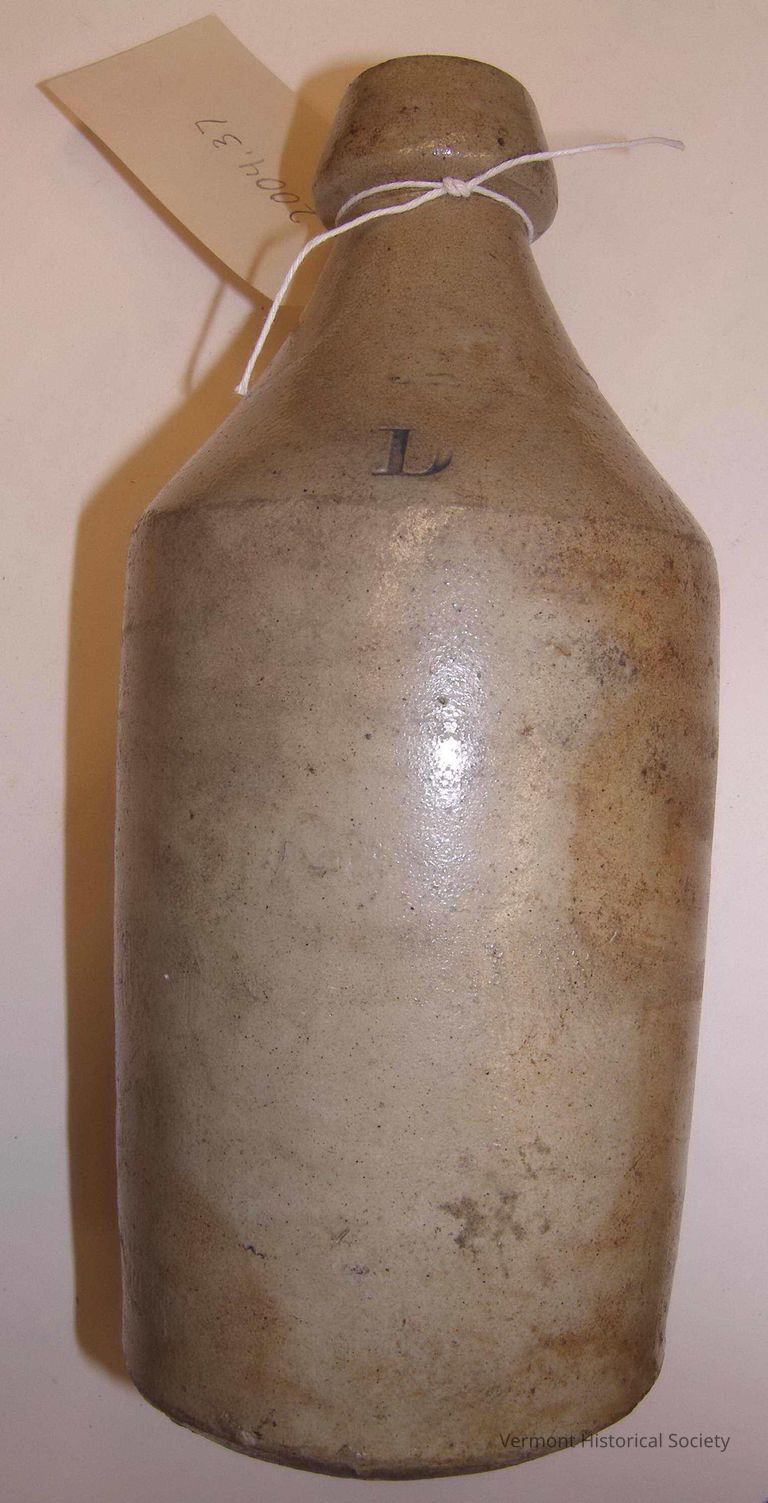 Cylindrical stoneware bottle impressed with the letter D just above the shoulder. The sides of the bottle are straight, and the neck tapers to a thick rim. The inside of the bottle is glazed with a dark brown glaze.
