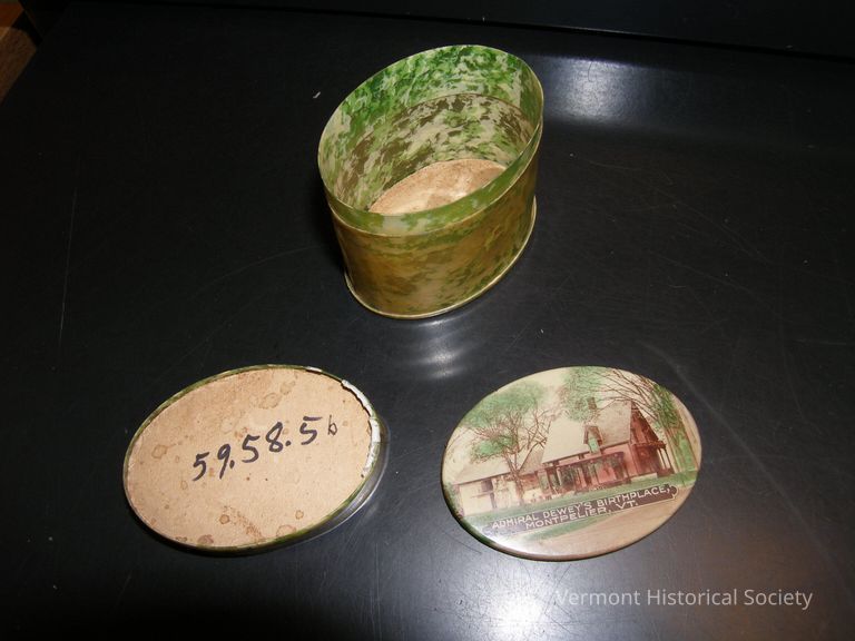 Small oval trinket box with lid. The box is lined with green-and-white marbled paper. The top of the lid is inset with a disk showing a red-and-white house with the label (ADMIRAL DEWEY'S BIRTHPLACE, MONTPELIER, VT." (now detached).