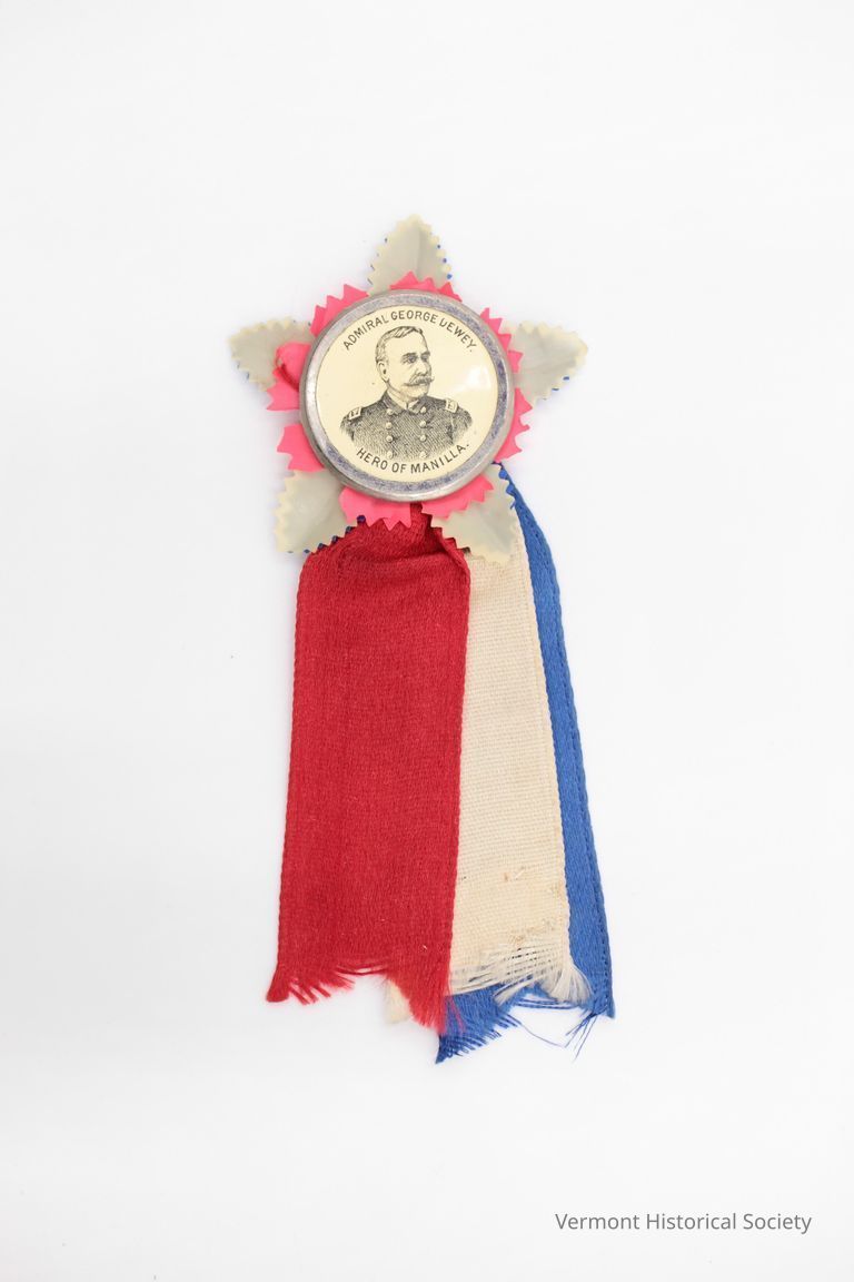 Commemorative ribbon consisting of a rosette with a three-ribbon tail. The rosette has pink, white, and blue plastic petals, held together by a metal button printed with a bust portrait of Admiral George Dewey and the words, "ADMIRAL GEORGE DEWEY HERO OF MANILLA." Three silk ribbons, red, white, and blue, hang from the rosette.