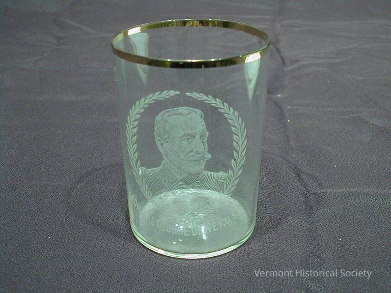 Glass tumbler etched with a bust portrait of Admiral George Dewey within a laurel wreath drawn in a copperplate style. The bottom of the wreath is labeled, "ADMIRAL GEORGE DEWEY, U.S.N." The rim of the glass is gilded.