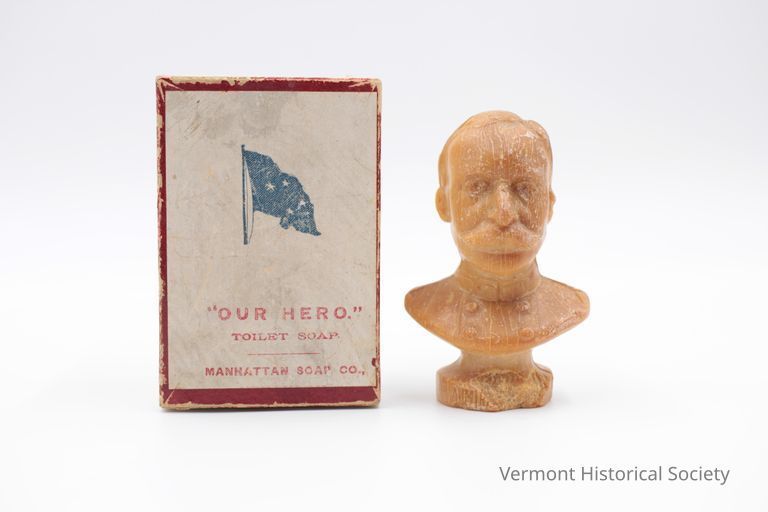 Souvenir bar of soap molded as a bust of a man with short hair and a large mustache (Admiral George Dewey). It is accompanied by a retail box printed on the lid with a blue flag and the words, ""OUR HERO" TOILET SOAP / MANHATTAN SOAP CO."