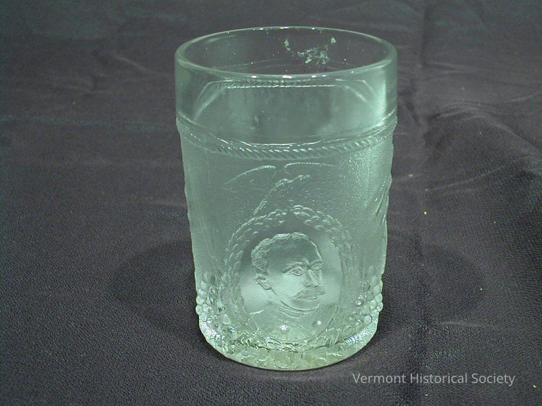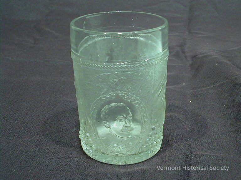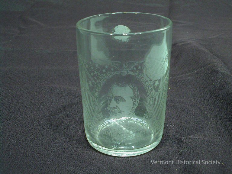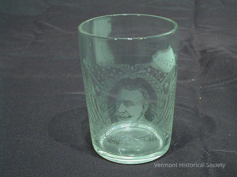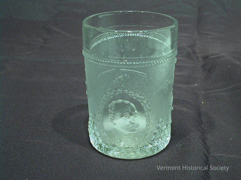 Glass tumbler etched with a bust portrait of Admiral George Dewey within a laurel wreath. The wreath is topped with a flying eagle and flanked by United States flags and Puerto Rican flags. The bottom of the wreath is labeled, "ADMIRAL GEORGE DEWEY THE HERO OF MANILA".