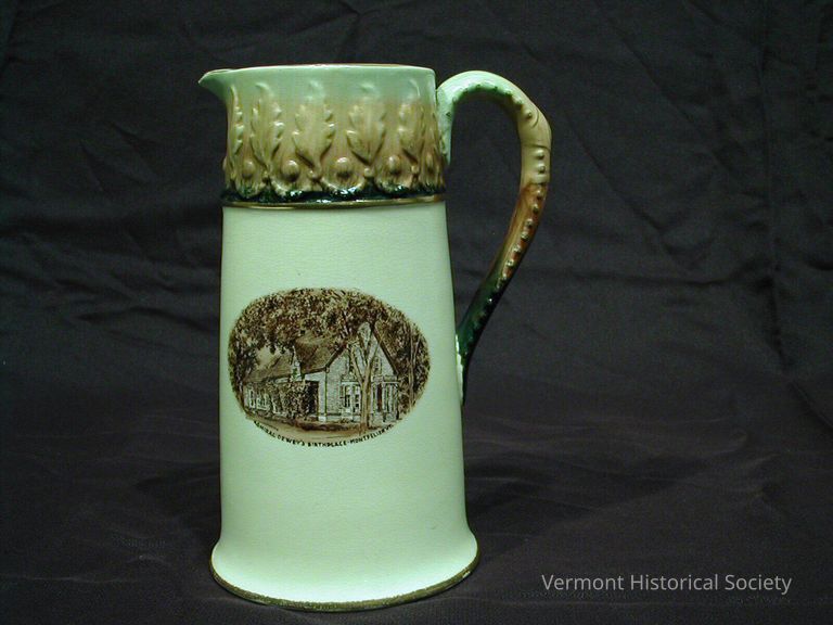 Souvenir pitcher showing a transfer-printed image of a house. The upper portion of the pitcher is molded with a repeated pattern of oak or acanthus leaves, painted in a gradient from black to brown to cream. The handle is molded with dots and painted with the same gradient. The body is printed with a oval containing a scene of a house with the label "ADMIRAL DEWEY'S BIRTHPLACE . MONTPELIER, VT."