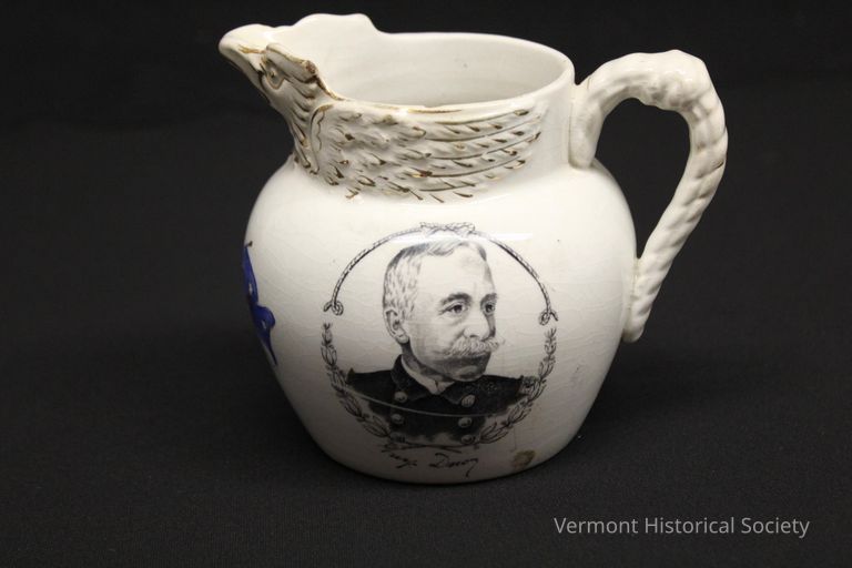 Small ceramic pitcher printed with a bust portrait of Admiral George Dewey on the left, crossed flags in the center, and a two-masted ship on the right. The spout is molded into the shape of an eagle, the details of which are highlighted with gilding. The handle is molded into the shape of a rope.