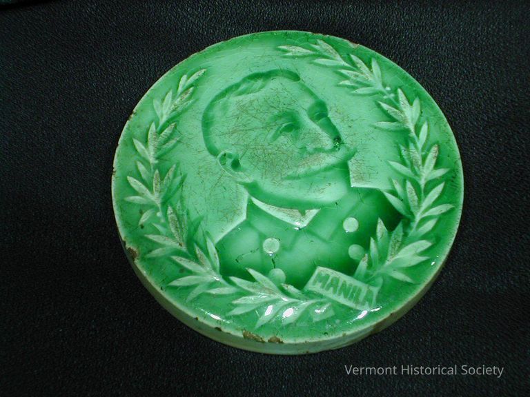 Green-glazed ceramic paperweight molded with a portrait bust of Admiral George Dewey. The bust is within a laurel wreath with the inscription, "MANILA".