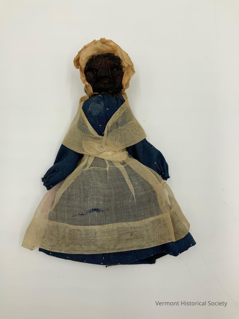 Doll made from a wooden clothes pin and a dried apple. The body of the doll is a non-springed clothespin. It is dressed in a blue dress with a sheer white apron and shawl that have been stiffened to give the doll a more humanoid shape. The head is carved from an apple that has since shrunk and turned black. It has white wool hair and a white cotton cap.