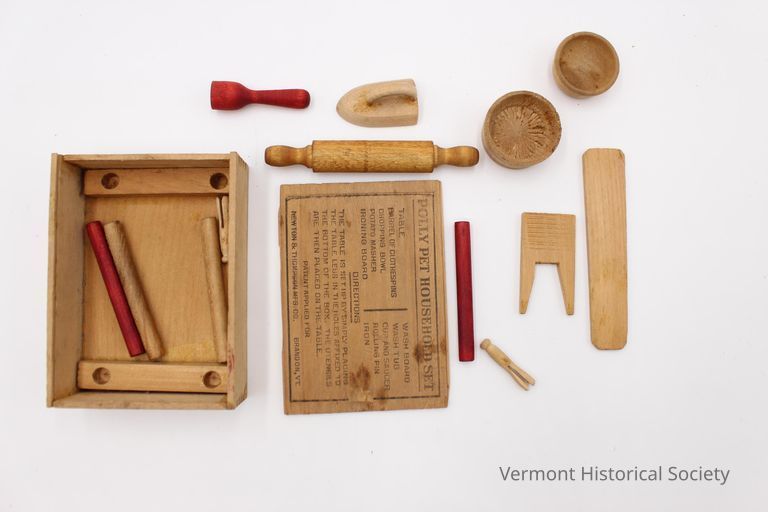 Box containing miniature wooden laundry and kitchen tools. The box uses four dowels to become a table for the set. The miniatures include a rolling pin, an iron, a potato masher, two tubs, a portion of an ironing board, and two miniature clothespins. The lid of the box is printed with the name of the set ("POLLY PET HOUSEHOLD SET"), a list of contents, and instructions.
