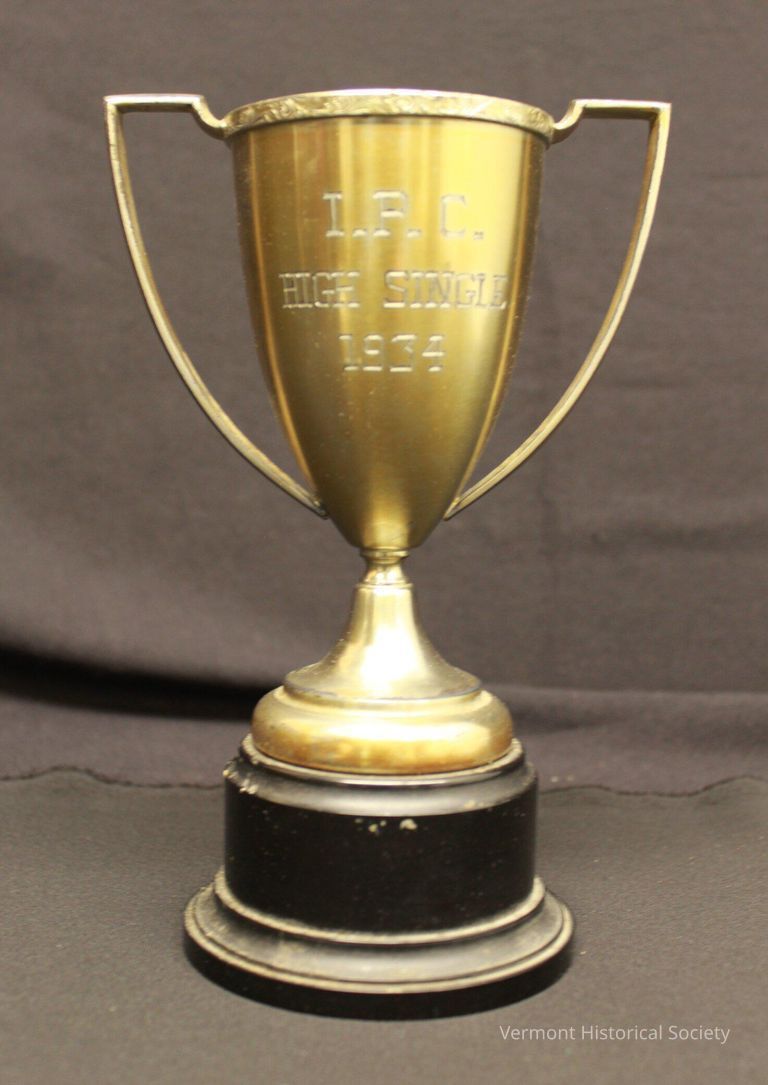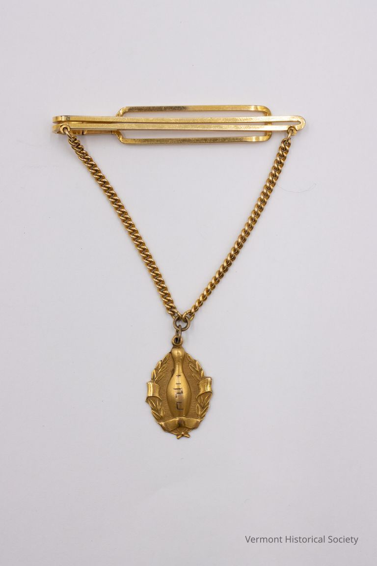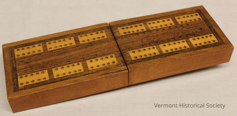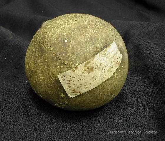 This baseball's just barely legible written label reads- "July 4, 1867/score 75-52/…. Champlains vs. …sp BBC." Vergennes fielded both the First Champlains and Second Champlains in the late 1860s. The other team name isn't clear enough to decipher. Does BBC indicate a Burlington Baseball Club? High scoring games like this one, often with over fifty runs, reflected earlier playing styles such as underhanded pitching and barehanded fielding. Connections by railroads and trolleys between towns and on Lake Champlain by ferries made it possible for the players and a growing number of spectators to enjoy what would become a favorite summer pastime, especially on the Fourth of July.