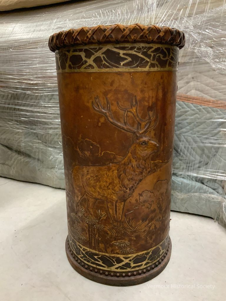 Leather umbrella stand decorated with tooled stag design & gilt trim. The stand is cylindrical.