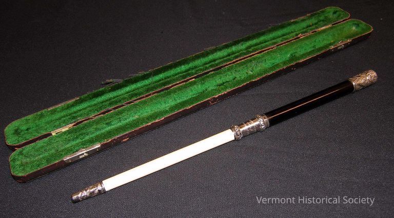 Black-and-white baton and carrying case. The baton is made of ivory and ebony. Both ends and the connection point between the two materials are mounted with ornately engraved silver. The center mount is engraved, "Josephine Edna Hovey from Spaulding Glee Club". The case is covered in black leather and lined in green velvet.