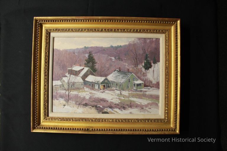 Oil on canvas painting of a Vermont hill village on a gray winter day. Central to the painting is a cluster of three dwellings surrounded by hills, trees, brush and snow. Signed by artist Bernard Corey in lower left corner. Gallery label on back of work from Atlantic Gallery gives the title as "Vermont Winter."