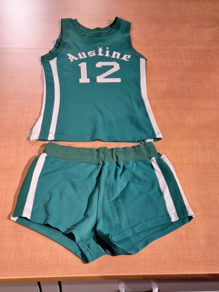 Green and white basketball uniform. The green tank top (a) has two white stripes down each side of the jersey and "Austine" in stylized lettering in an arc across the chest. The number "12" is stitched below the school name in white block numbers. A larger number 12 is stitched in white on the back.