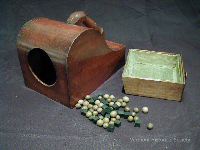 Wooden ballot box and voting chits. The box has a curved top with a carved handle. The front of the box has a large, circular hole. There is a drawer that sits in the base of the box and can be pulled out from the back. It is accompanied by several small white wooden balls and black wooden cubes.