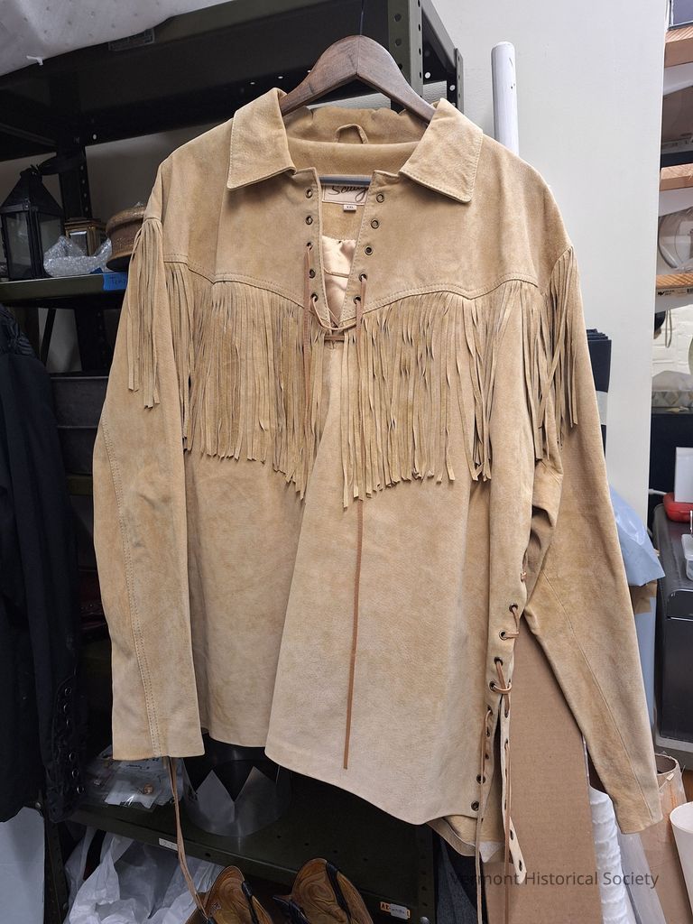 Tan suede tunic. The tunic has a laced quarter-length opening and a standard folded collar, fringe around the chest and at the top edge of the sleeves. The tunic has slim long sleeves and laced sides at the waist.